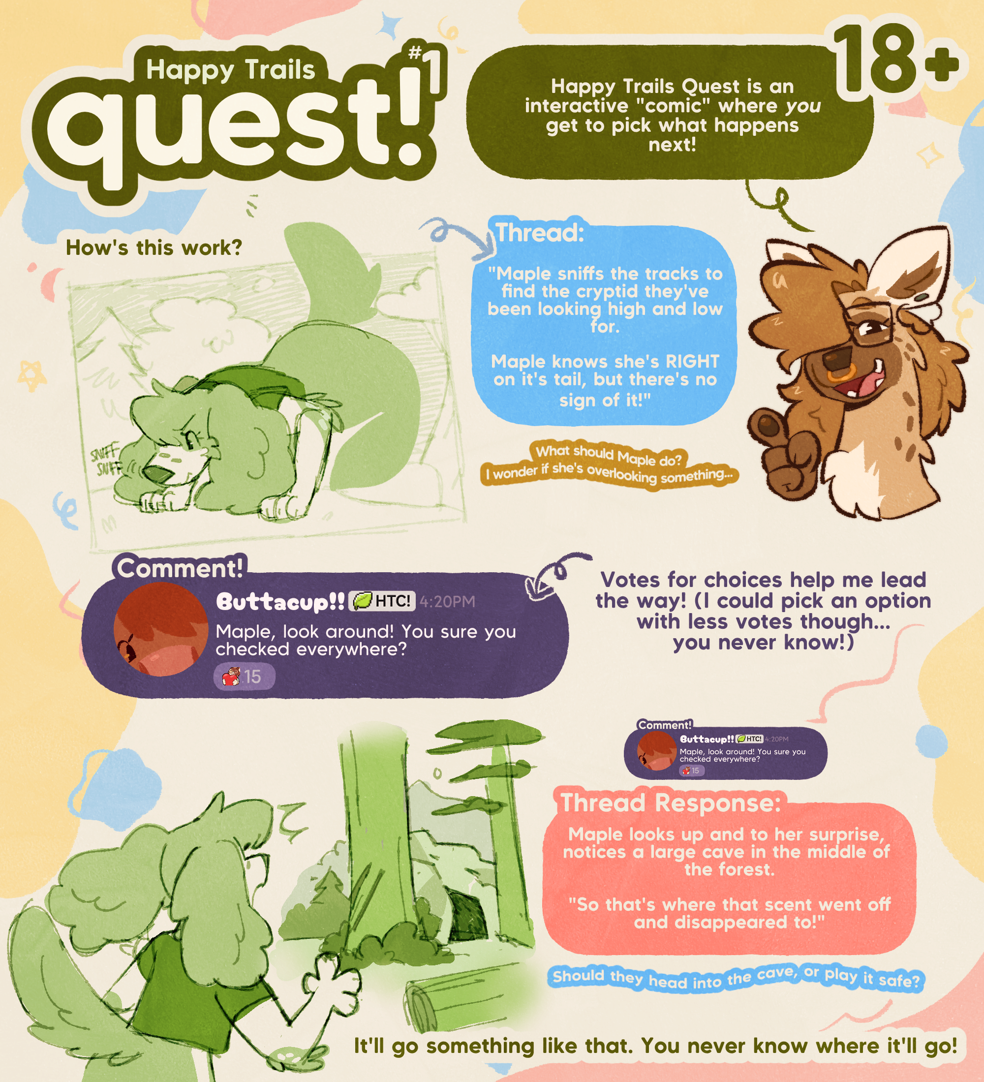 Happy Trails Quest is an interactive webcomic I’m running! Join the Patreon discord to reply to each new panel, and give me ideas for where it should go!